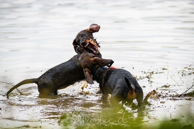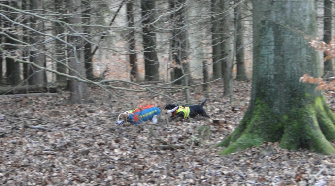Januar 2016, hier jagen ein Teckel und ein Schwyzer Niederlaufhund kurz
