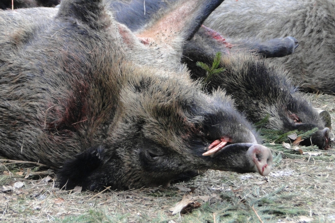 ein starker Keiler und ein junger Rothirsch liegen auf der Strecke