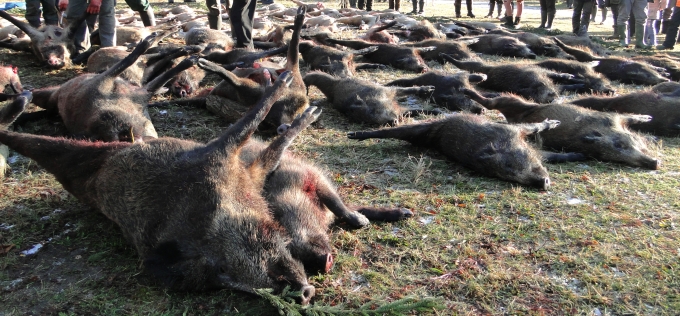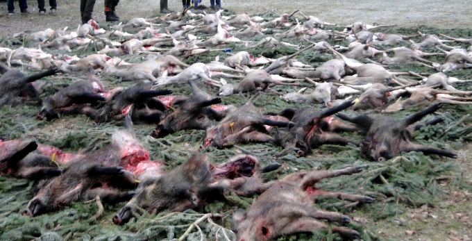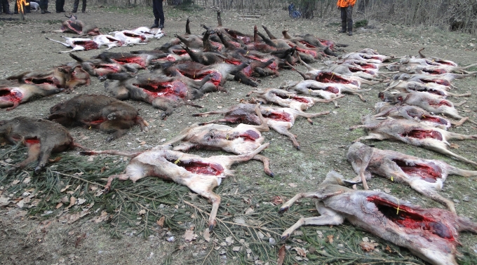 Strecke vom ersten Jagdtag (108 Stücken) in drei Stunden mit wenigen Schützen