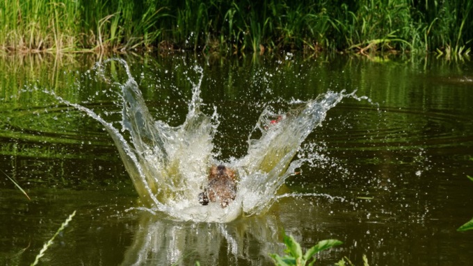 Noel schwimmt im tiefem Wasser zur Ente, er besteht den Wassertest mit