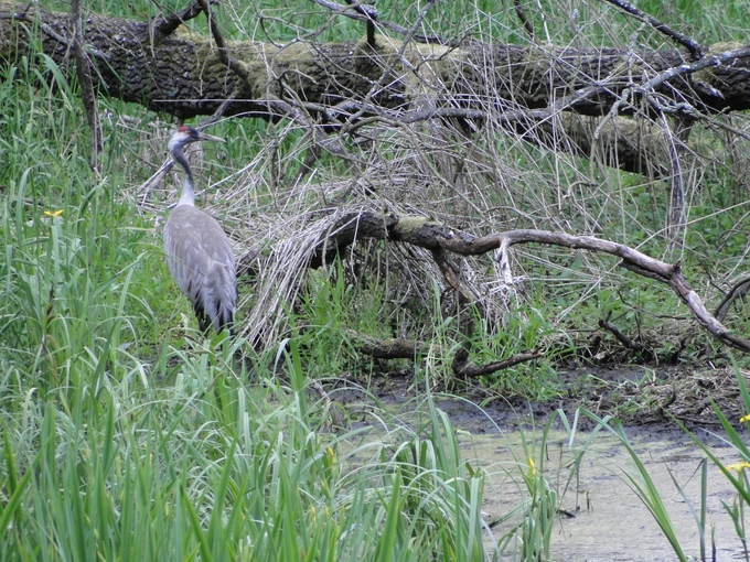 Ende Mai, ein Kranichaltvogel bewacht seinen Nachwuchs.