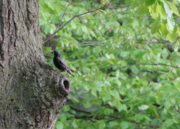 Der Star bei der Brutpflege über seinem Nest in der alten Eiche.