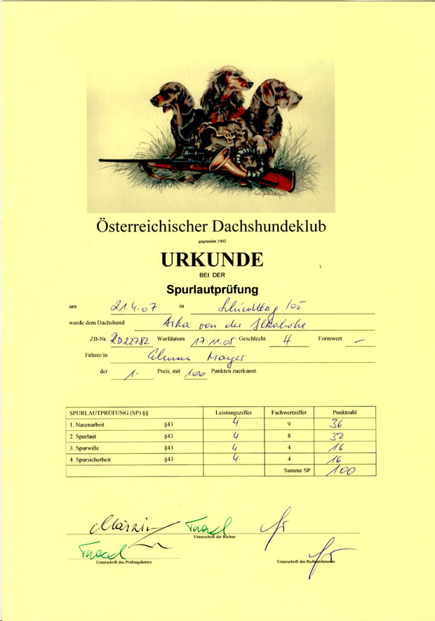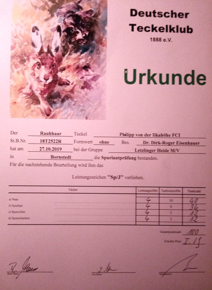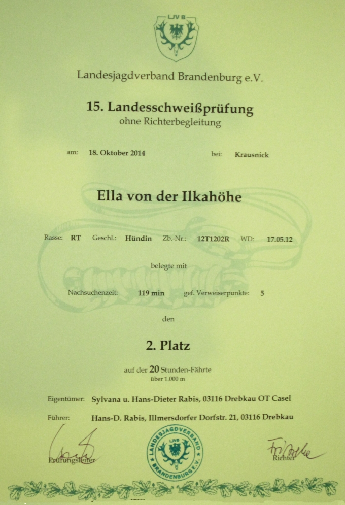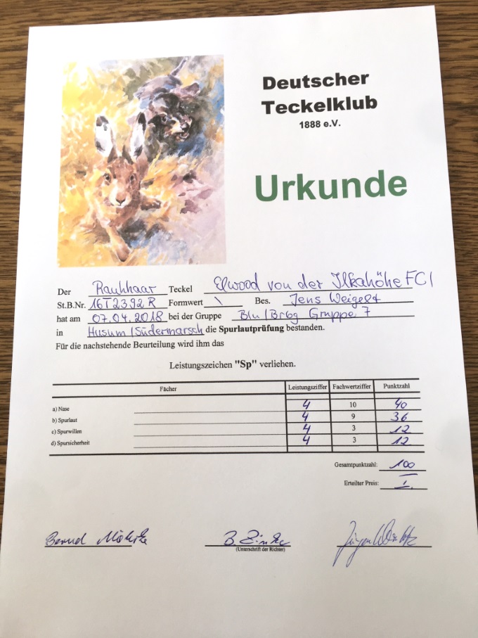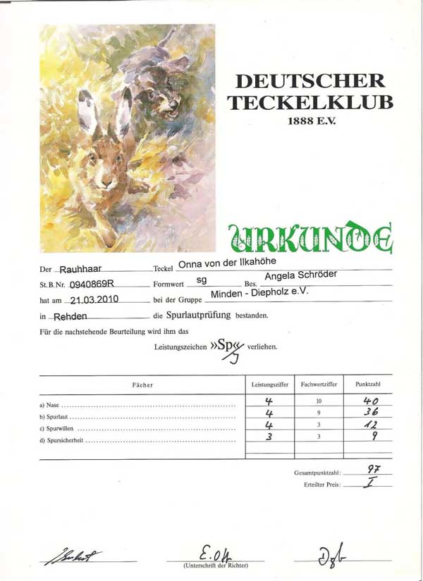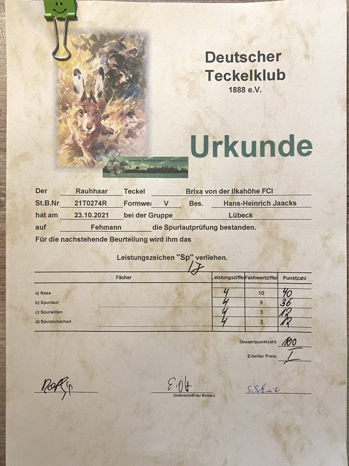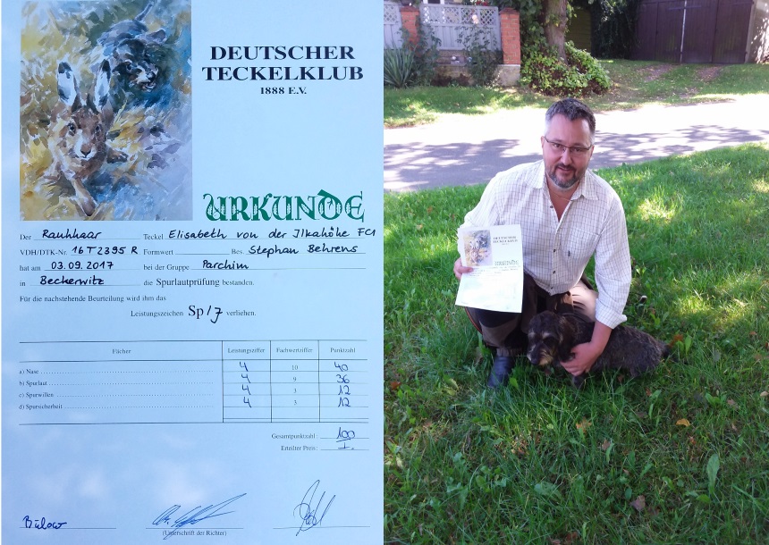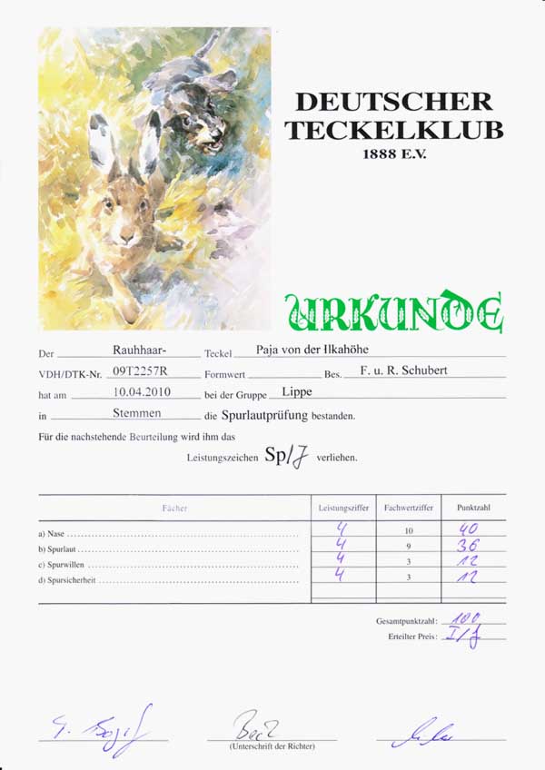Cleopatra von der Ilkahöhe Spurlautprüfung mit 100 Punkten I. Preis und