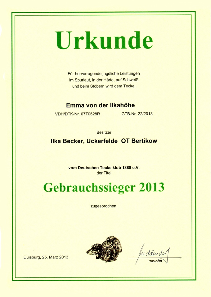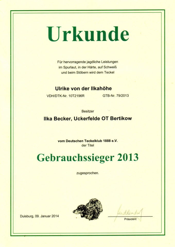 erfolgreiche Teilnahme an der Bundessieger-Suche in Chorin 1998 mit Falk von der Ilkahöhe erfolgreiche Teilnahme an der Bundessieger-Suche in Chorin 1999 mit GS94, IACh96 Jana vom Katharinenhof erfolgreiche Teilnahme an der Bundessieger-Suche in Chorin 2000 mit GS00, IACh00 Heidi von der Ilkahöhe erfolgreiche Teilnahme an der Bundessieger-Suche in Chorin 2004 mit GS01 Anna von Fürstenwalde |