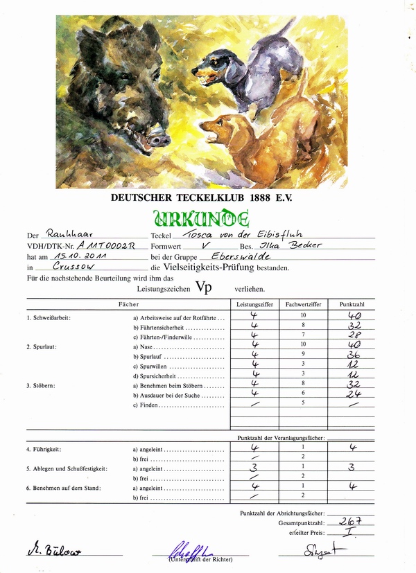 FCI-Gruppe 6 (Lauf- und Schweißhunde) erreichte sie von 17 vorzüglichen Hunden